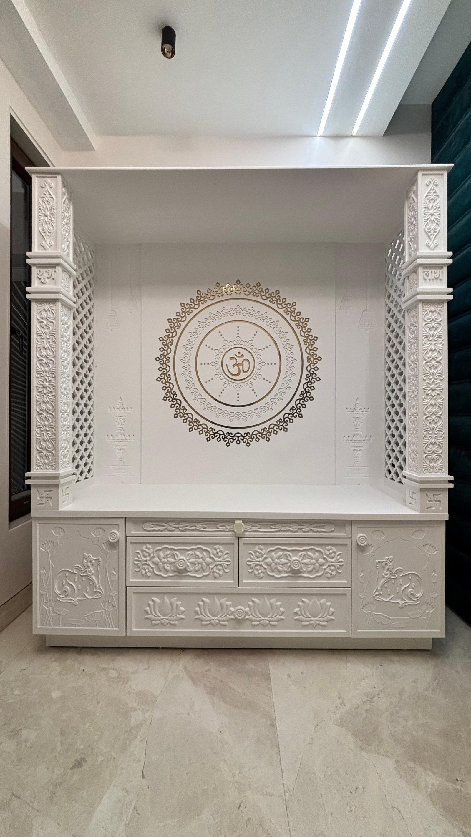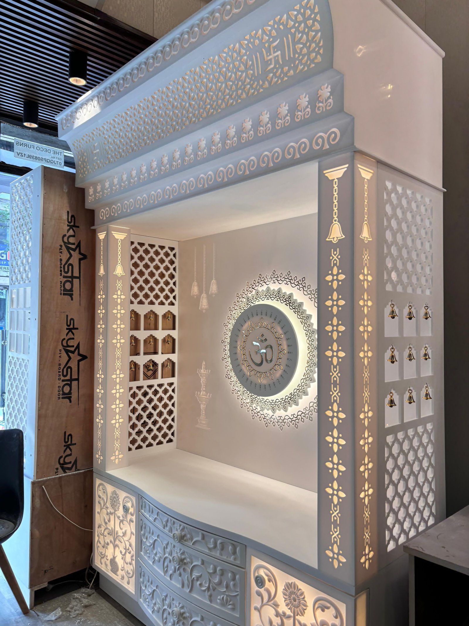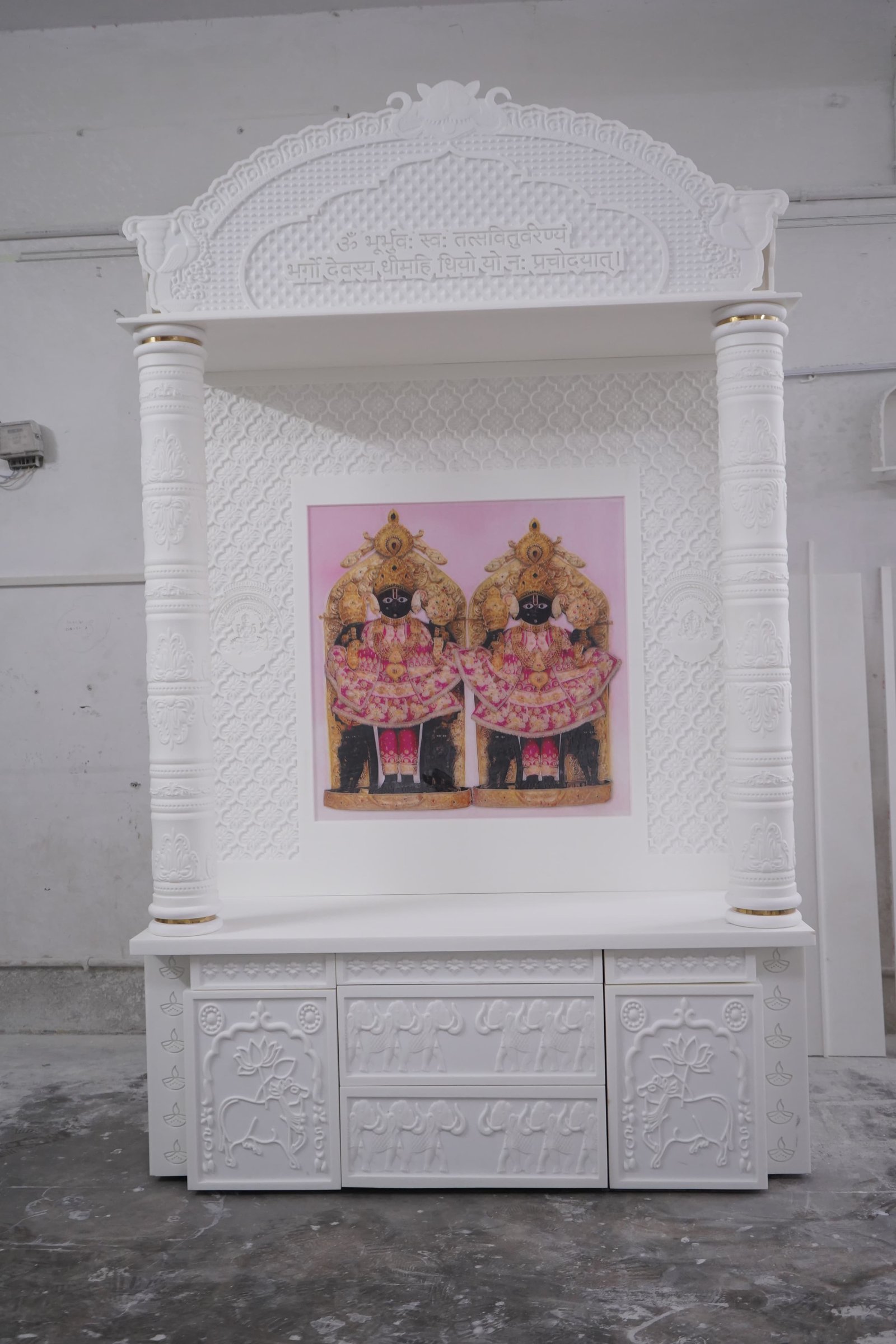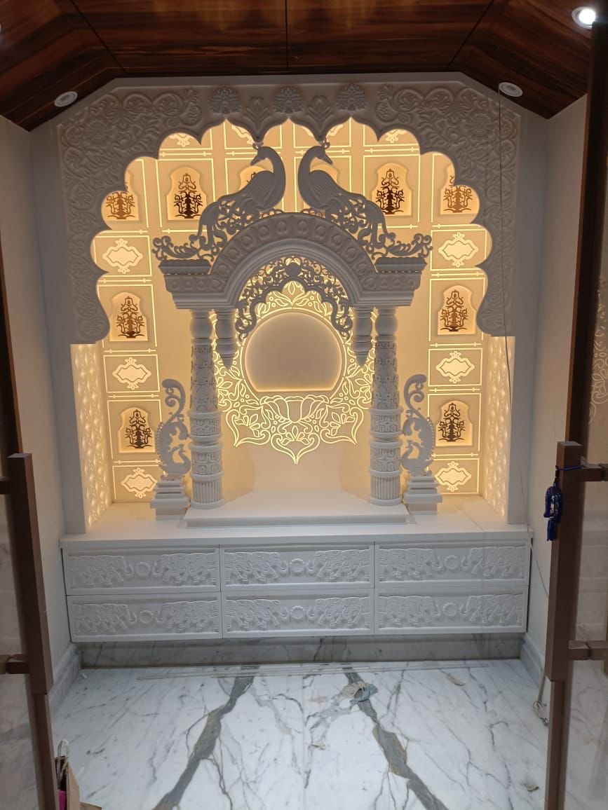 At Divine Studio, you can check our latest designer luxury corian mandir for home which we have in our display all size luxury corian mandir are available.